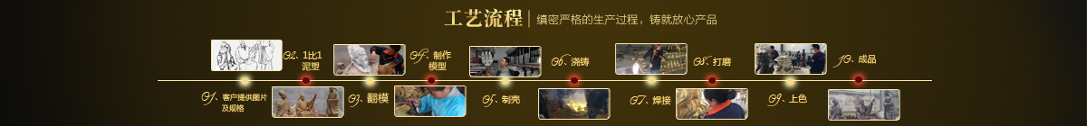 制作一件完美的鑄銅雕塑,最重要的步驟就是制作泥塑模型,然后再用工業(yè)硅膠拓印、翻模。所以泥塑的姿態(tài)、神情生動與否直接影響最終銅雕塑的品質(zhì)。所以我廠一直對泥塑模型的制作格外重視。我廠以雕塑為本,以藝術(shù)為根,挾中華文化之傳統(tǒng),偕歐陸藝術(shù)之風韻,風格獨特,盡顯淋漓盡致。我們本著大膽創(chuàng)新、勇于突破的精神,以追求卓越為導向,堅持寧缺勿濫為原則,并可依照您提供的要求,為您量身設(shè)計制作。我廠人才濟濟,有智慧嚴謹?shù)墓芾戆嘧樱姸嗄贻p充滿激情、充滿創(chuàng)意的專業(yè)設(shè)計團隊、有專業(yè)技術(shù)精湛的雕塑制作人才和專業(yè)的施工隊伍。他們不僅具深厚的文化藝術(shù)底蘊,更汲取當代雕塑精華,博采眾家之長,作品既有嚴肅莊重寫實題材,也有輕松前衛(wèi)的抽象題材,表現(xiàn)手法上浪漫主義中不乏樸實,現(xiàn)實主義中蘊涵著激情,設(shè)計理念貫穿古今、融匯中西,深刻詮釋著藝術(shù)的精髓,把古典主義和后現(xiàn)代主義完美的融合,將雕塑藝術(shù)演繹為力的凝聚、美的體現(xiàn),讓人們感受到的不僅是一種藝術(shù)的浪漫與優(yōu)雅、粗獷與悲壯、更是豐富的優(yōu)秀藝術(shù)寶藏和文化傳統(tǒng),讓您在藝術(shù)與文化中穿流,在時空中飄蕩,使靈魂在藝術(shù)的海洋洗禮。 MORE+